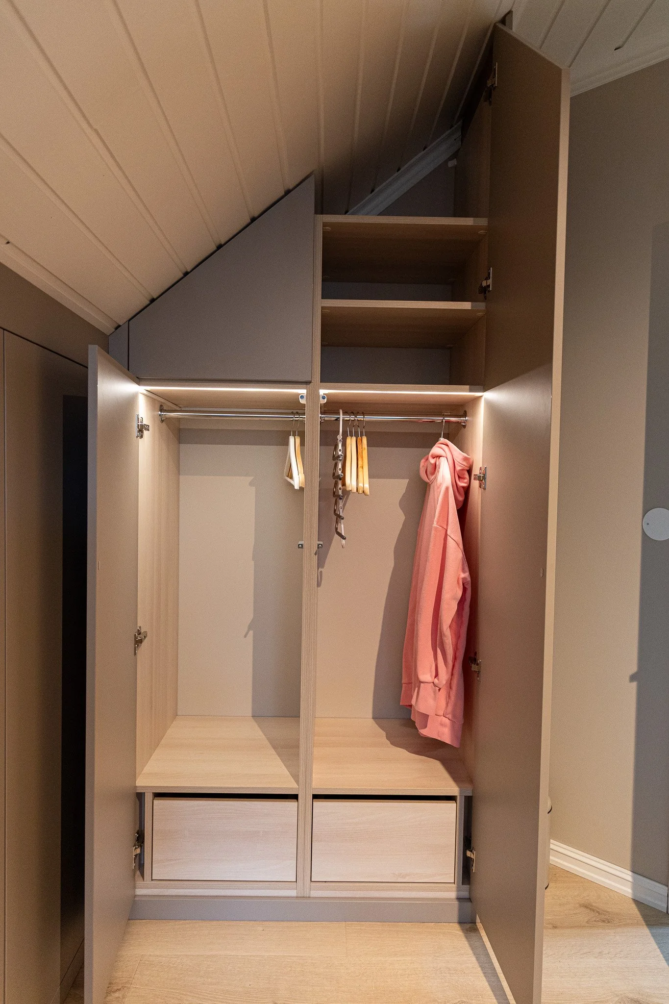 Plassbygde garderobeløsninger for skråtak og under trapper – designet for maksimal utnyttelse av vanskelig plass.