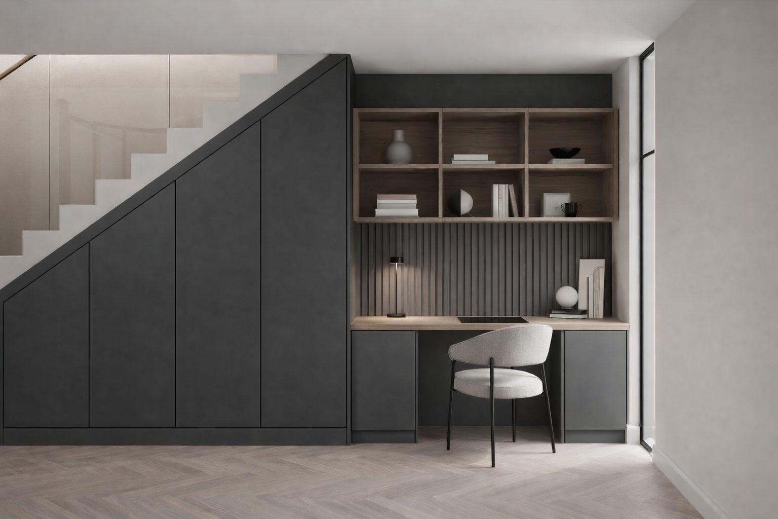 Skreddersydd etter rommets form, med funksjonelle løsninger og et helhetlig uttrykk.