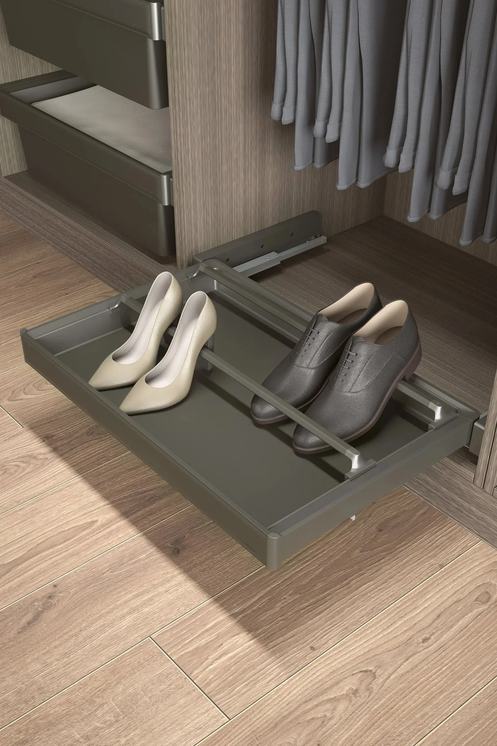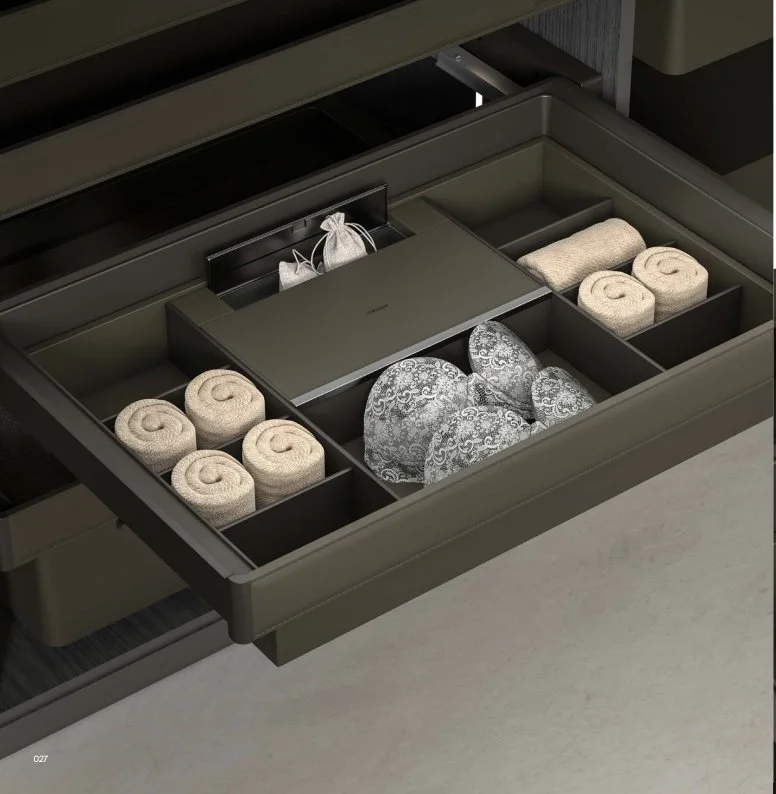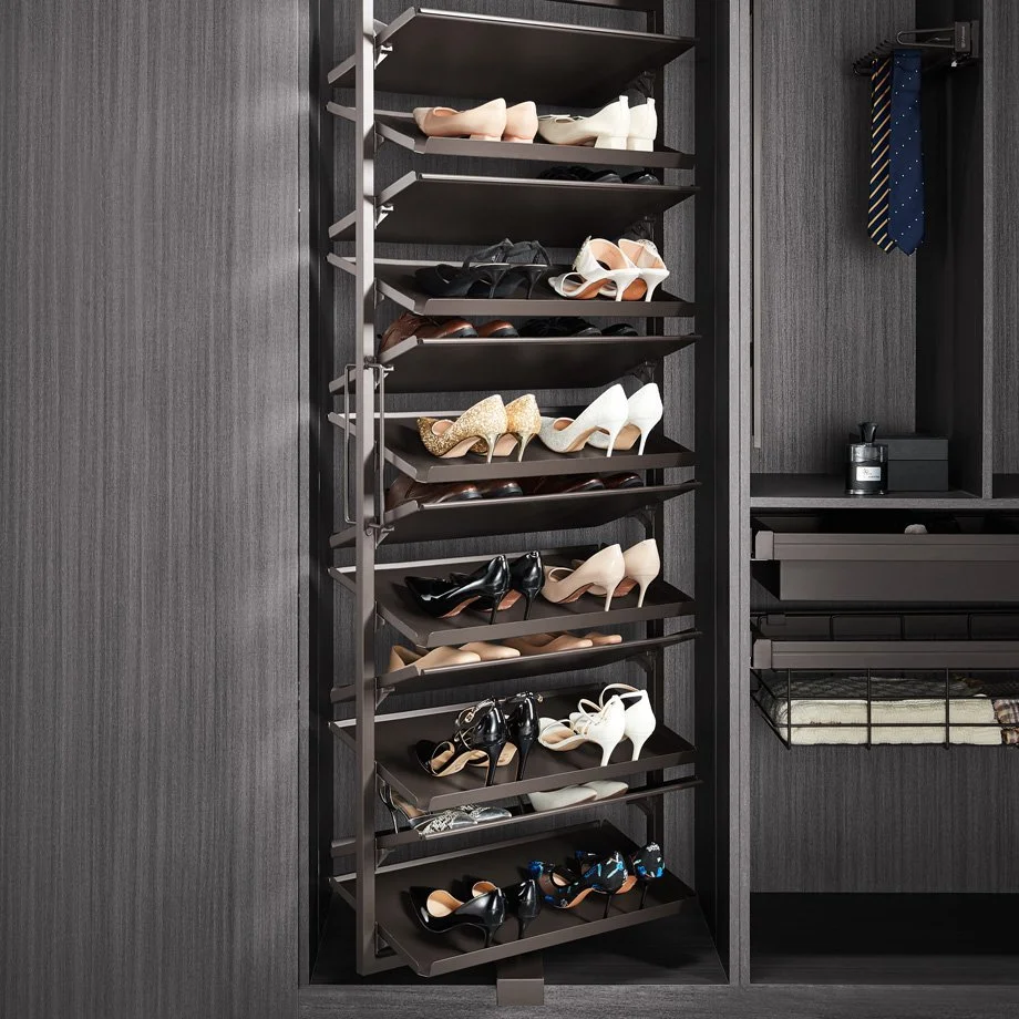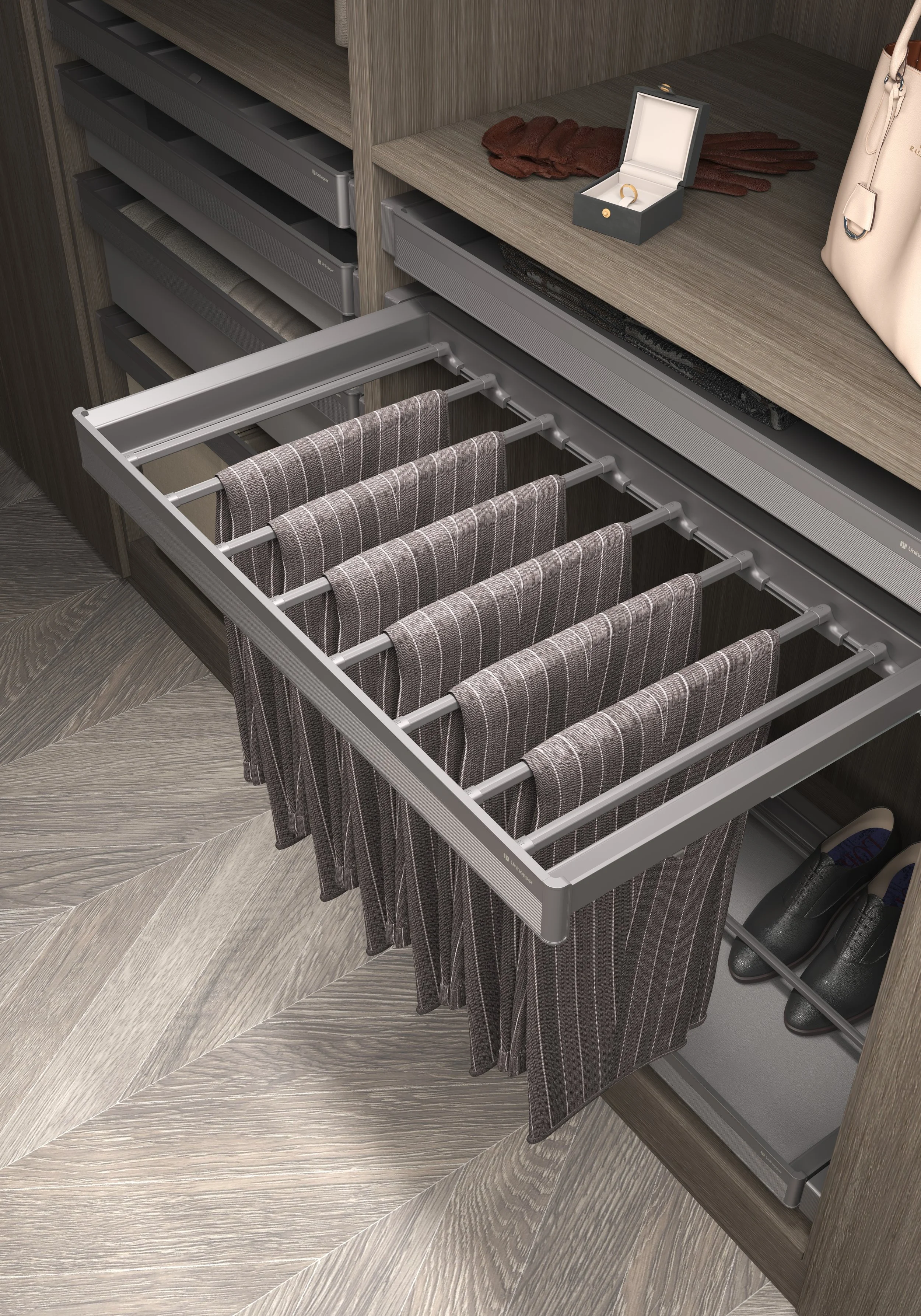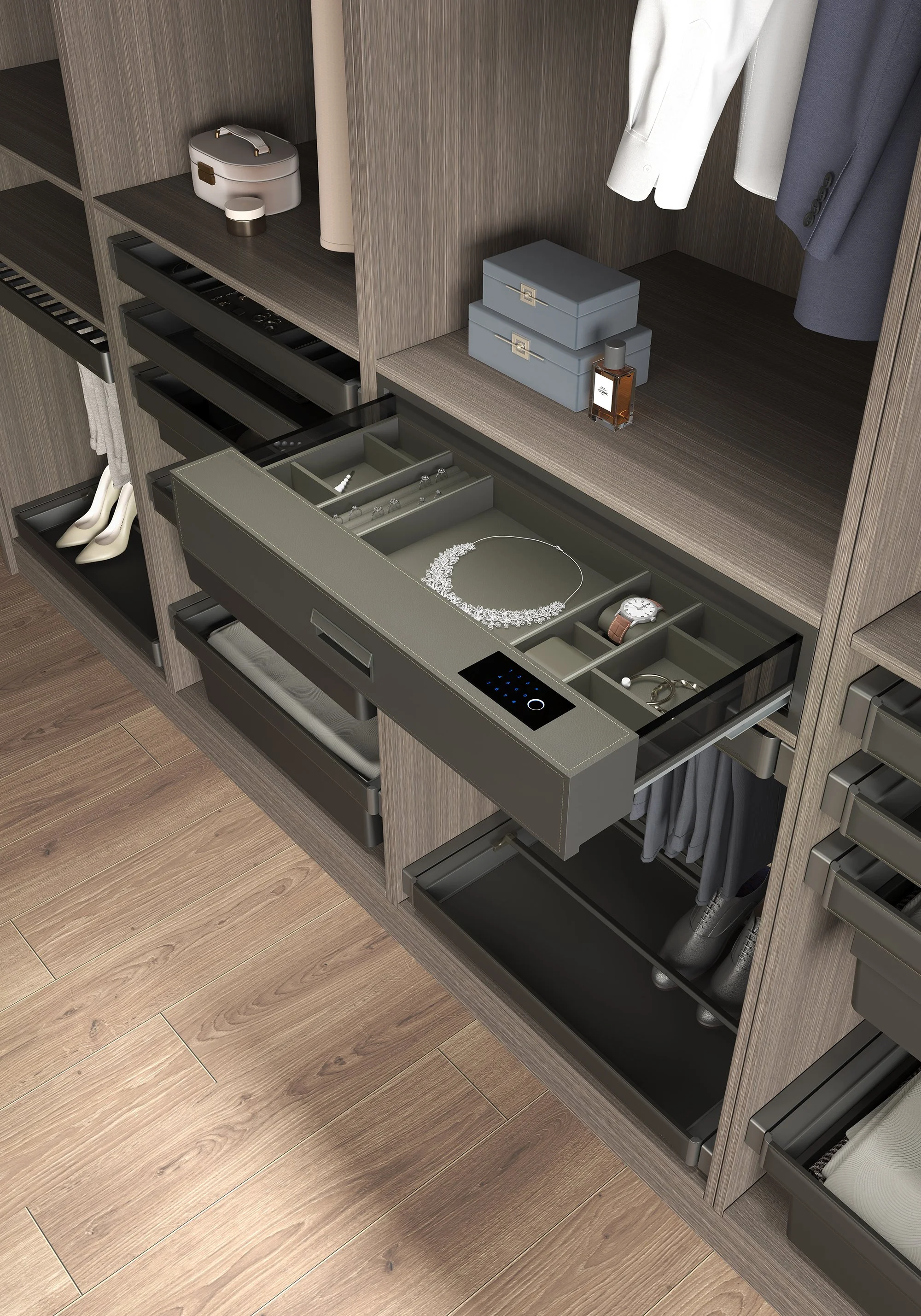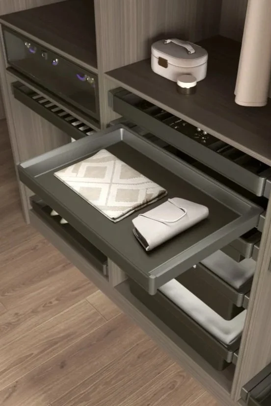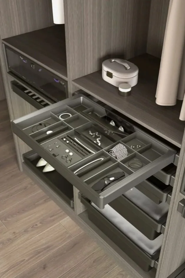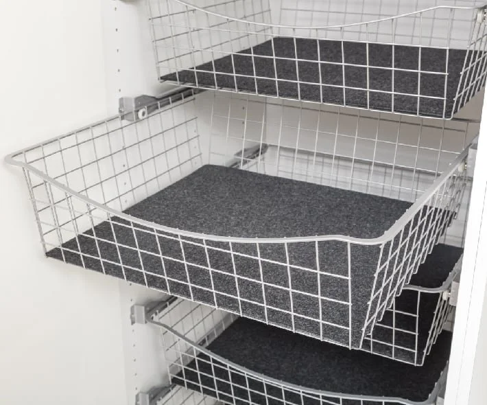 Vi tilbyr et bredt utvalg av smarte oppbevaringsløsninger. Uttrekkbare skuffer, smykkeskuffer, bukse- og skohyller, trådkurver og praktiske innsatser – som tilpasses garderobens mål og dine behov. Alt er designet for enkel tilgang, effektiv bruk av plassen og lang levetid.