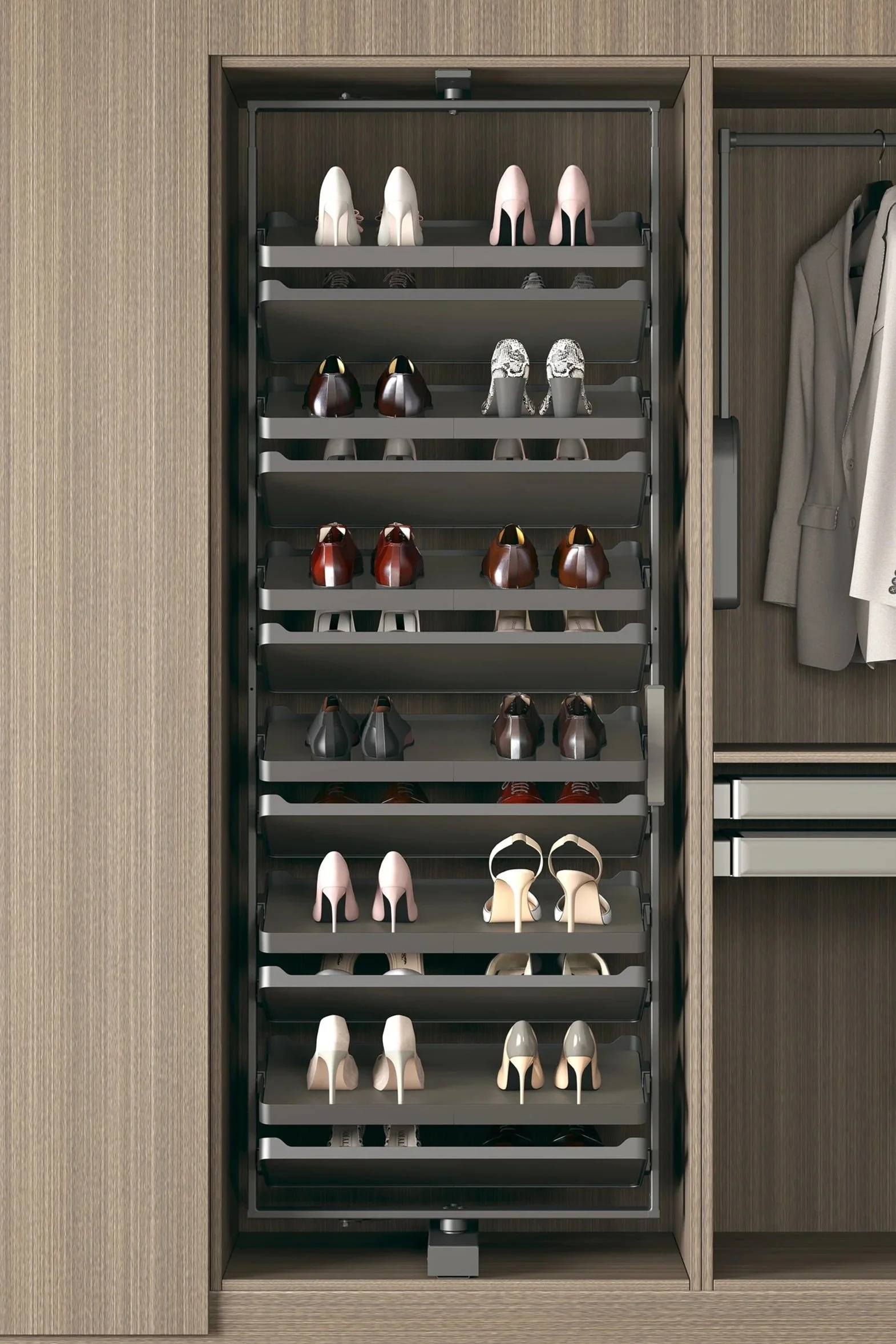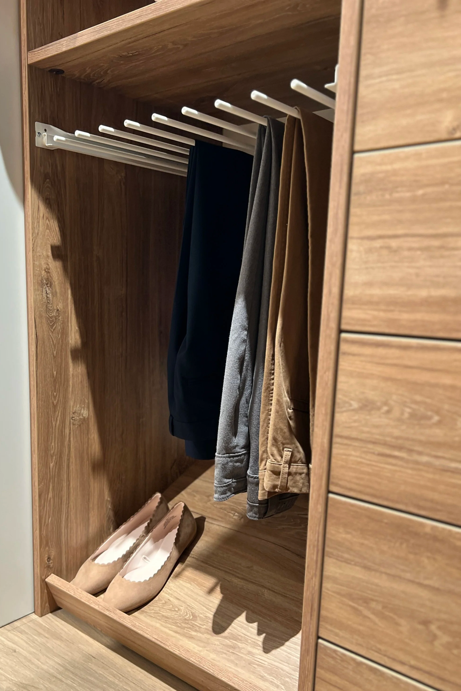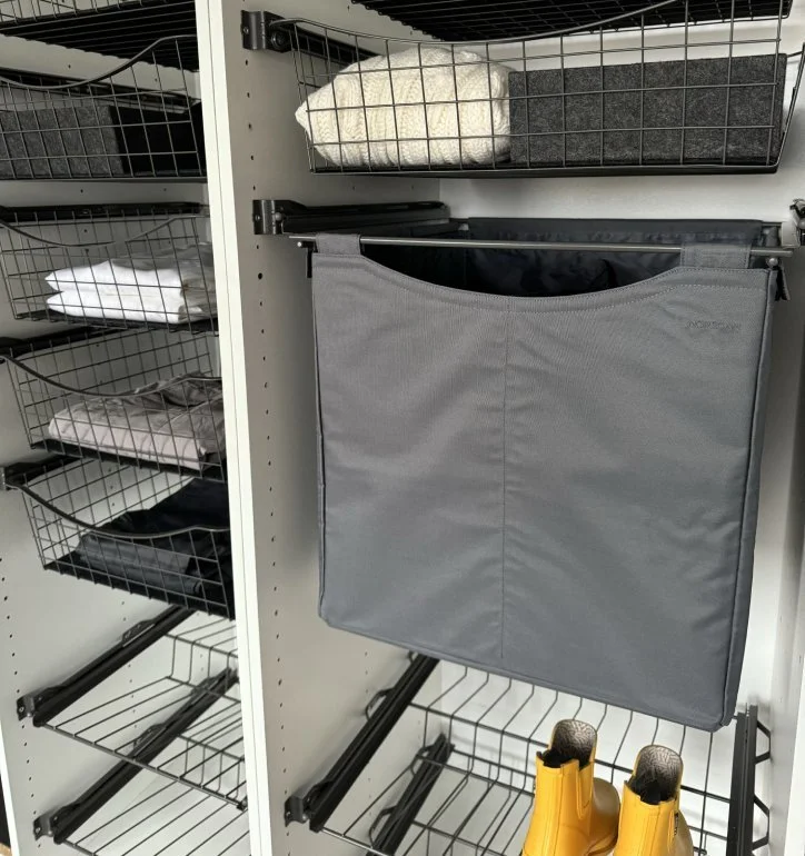 Våre tilbehørsløsninger kan kombineres fritt og tilpasses både til hengslede dører, skyvedører og walk-in garderober. Resultatet er en garderobe som ikke bare ser bra ut, men som fungerer optimalt – hver eneste dag.
