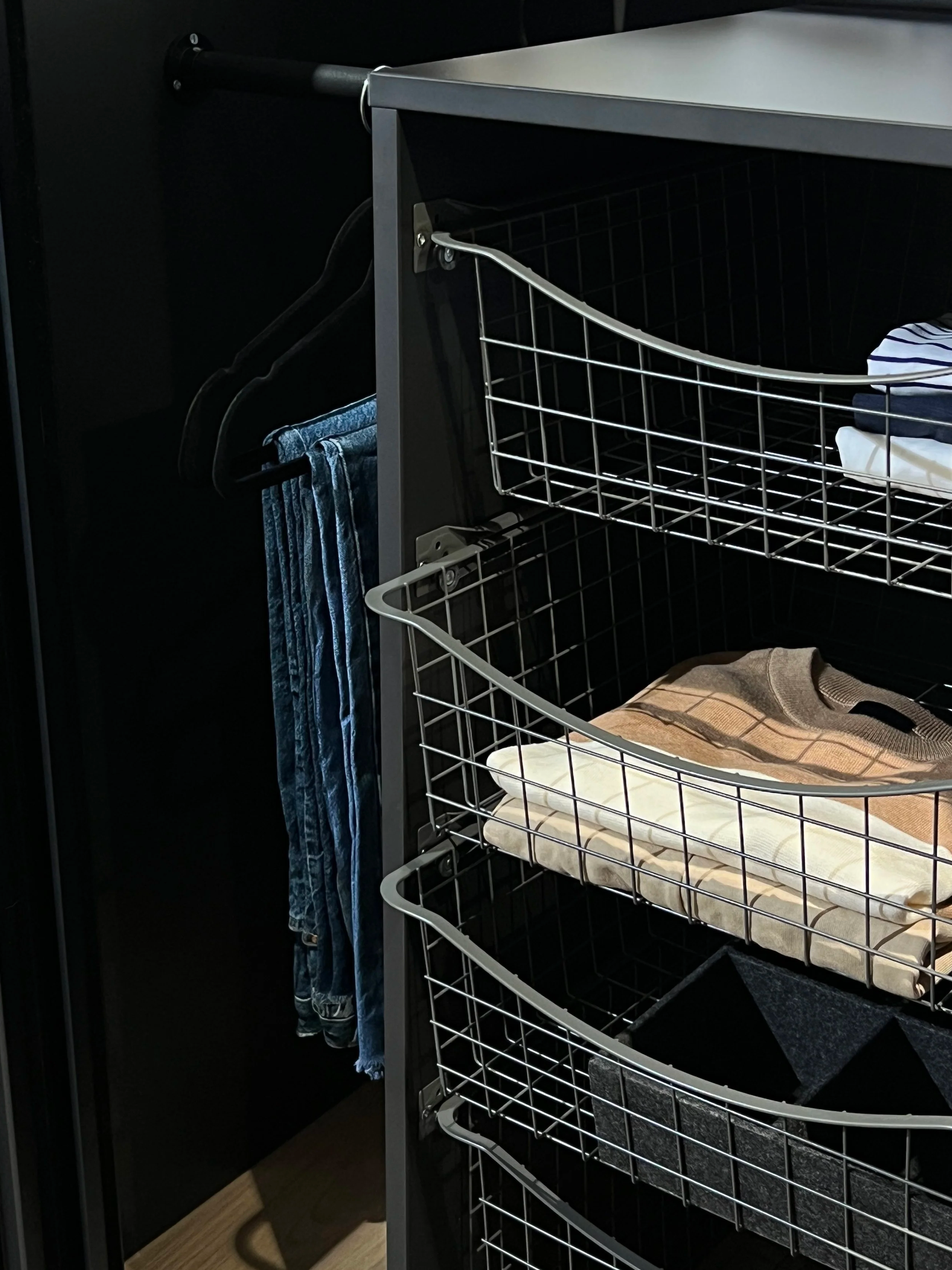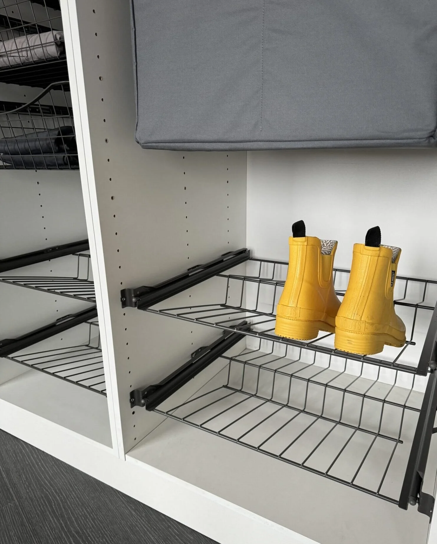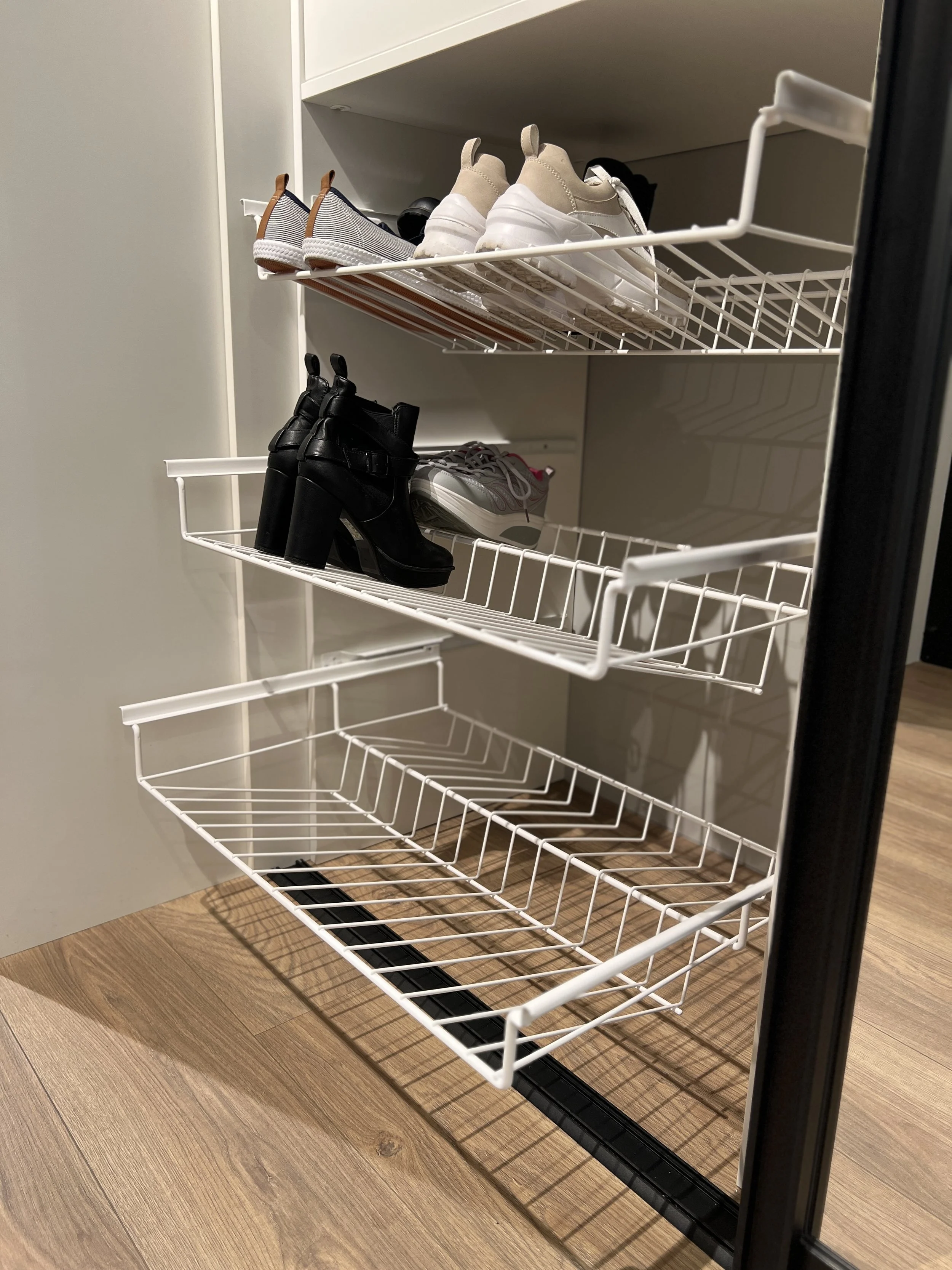 Trådkurver og skohyller leveres i faste mål som lett kan integreres sømløst i garderobeløsningen, og skaper en gjennomtenkt kombinasjon av funksjonalitet, kvalitet og solid håndverk. Resultatet er en praktisk, holdbar og elegant løsning som varer over tid.