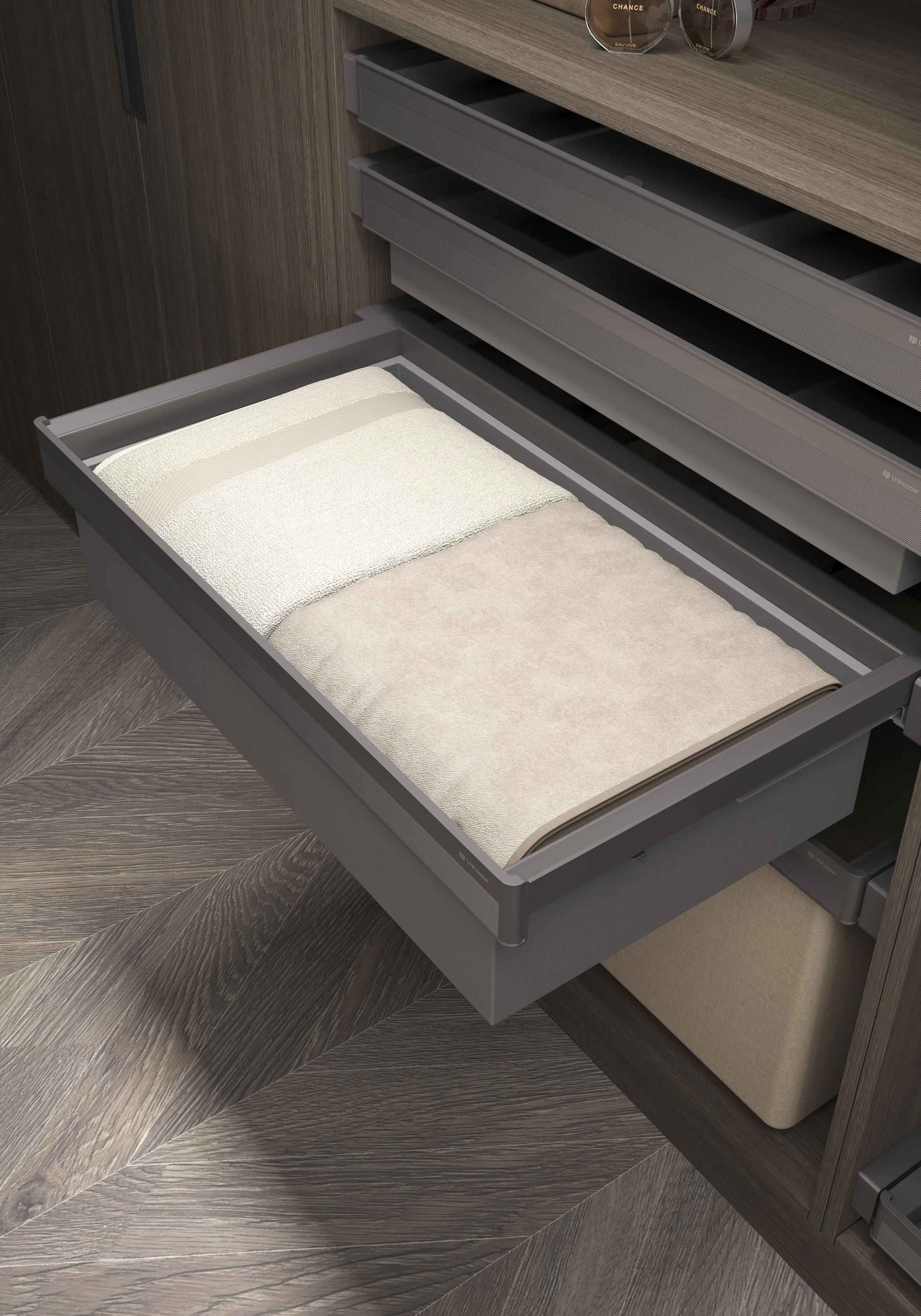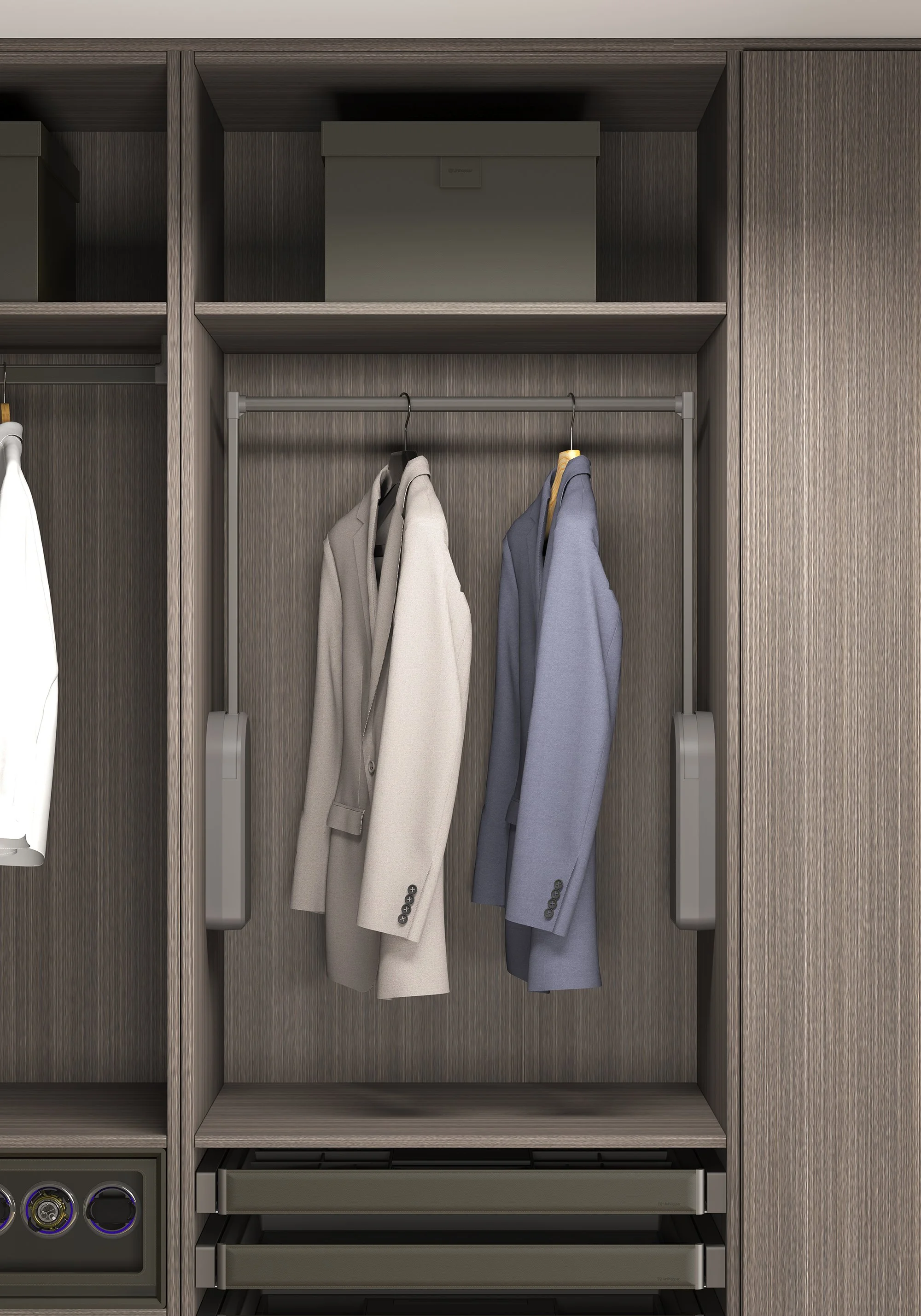 Produktene fra Unihopper produseres i faste bredder på 60 og 80 cm, og er utviklet for å gi et ryddig, elegant og helhetlig uttrykk i garderoben. Med tilbehør fra Unihopper får du den siste, gjennomtenkte finishen. Det brede utvalget gjør garderoben både mer funksjonell og tilpasset ulike behov.